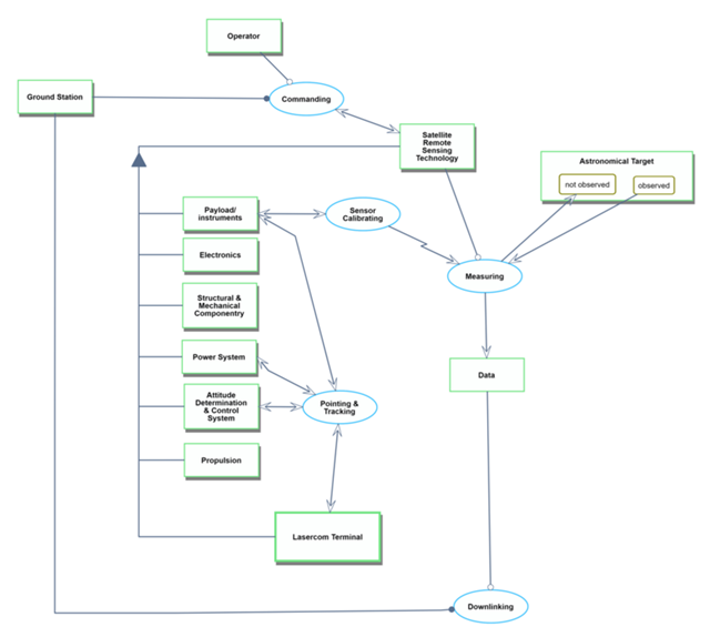 The Sensing Satellite Level OPM, shows how the many Tier 3 Technology physical objects interact and comprise the Level 2 satellite to preform operations that allow the satellite to collect, process, and send/recieve data to/from the operational ground station. The informational and systematic processes here, display some of the interactions taking place between these technologies.