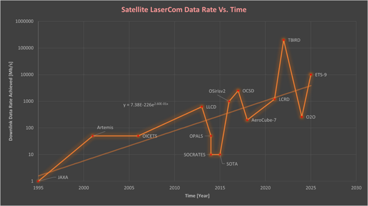 Modeling Rate of Improvement: While this timeline does a good job of creating an overall picture of the progress made in Lasercom both in rapidly improving optical data rate, dL, capabilities and increasing frequency of lasercom mission/investment of all satellite types, it is a bit tricky to model a representative δdL/δt due to the range of missions (demos, functional terminals, ect), satellite platforms, orbits and orbit/orbital altitude. Furthermore, the recent TBIRD demo is a serious outlier, it’s a promising sign for the future of lasercom and achievable dL, but it skews any form of least-squares regression fit to the model. However, an overall trendline and equation can be formatted pretty nicely to the logarithmic y-axis as shown below.