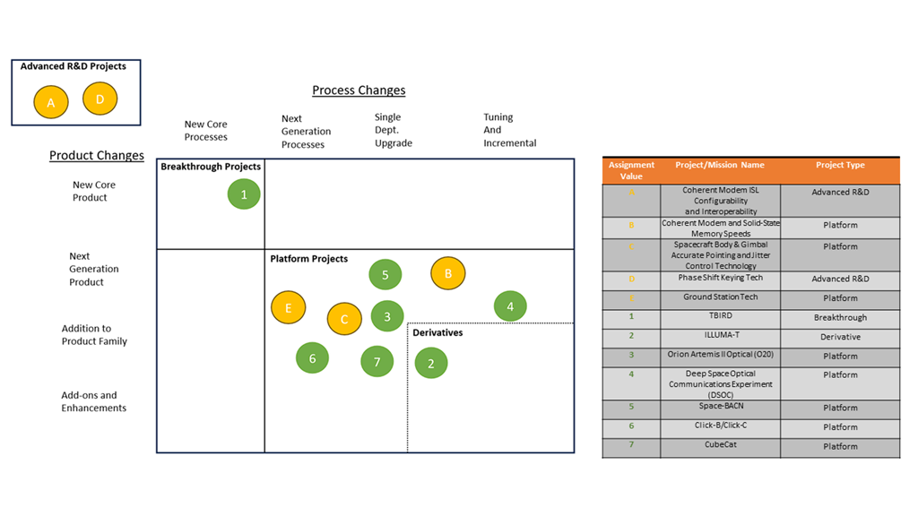 In the interest of predicting the future expansions and improved capabilities of space-based LaserCom, a set of Space Optical technological research endeavors and specific LaserCom-based missions have been flagged for the roadmap and organized below. These include new processes and products from companies and research facilities in the Advanced R&D and Breakthrough level technology that are still in development. It also is comprised of missions such as TBIRD and ILLUMA-T that have launched as optical experiments and are currently or about to undergo testing to demonstrate new applications of Lasercom technology. These various Projects and Missions are described and then parsed into an R&D Framework.