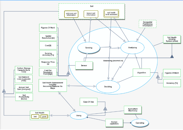 Soil health is a growing field in the agriculture/agronomy/soil sciences fields. In the future, farmers will want to have insight into what is happening in real-time with the soil during each production step. This will lead to greater soil productivity and fertility, reducing fertilizers and insecticides, improved compaction management, and the ability to predict what is needed to sustainably grow a crop and achieve optimum yields. Farmers are starting to realize they can achieve lowered input costs and/or higher yields if they can improve their soil health (specifically increase their soil’s organic matter % (3% or higher is “healthy soil”), bacteria:fungi ratio, etc.). Additionally, future regulations are likely to keep hitting this area. This system would sense key soil parameters and provide recommendations to improve soil health, thus there are many sensing technologies that could show up on this technology roadmap (especially in the newer, harder to sense field of soil biologicals). The overall “soil health sensing system” could include value outputs that provide insights into what soil health level currently is, as well as include recommendations for ag machine functionality/operational changes that improve soil health.