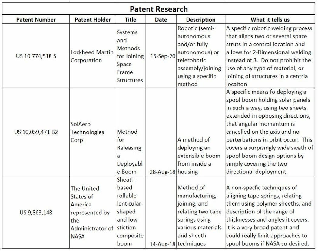 An investigation into patents for space boom technology reveals a lot of patents pertinent to any future boom work. The major theme that stands out is that types of booms are not limited, but methods for releasing or applying the technologies are what companies aim to protect. So if a development requires a boom the team is likely free to use the one that fits their needs best, but will need to check intellectual property and patents before implementing to be sure the method of use isn’t protected. Three key patents relevant to space booms are summarized below: