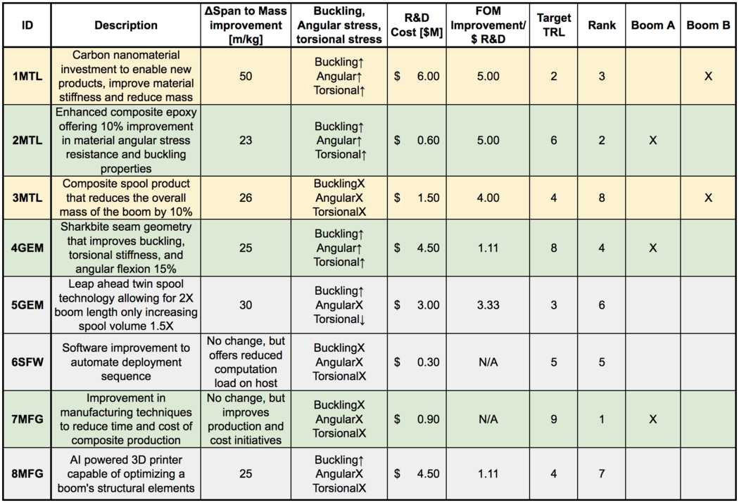 Recalling our utility function (see section on Technical Model) where L = Length of the boom (context dependent minimum length required) [m], S = force [N], and M = mass of the boom [kg], materials investments that improve buckling, torsional, and angular stress properties can be compared and contrasted in order to make sound investments. Additionally, we can invest in materials and structures that maintain those force properties and reduce weight. Finally, creative geometry and transformational characteristics of booms would also be sound investments. For each of these we will look at the change in FOM, the duration it takes to achieve that change, and associated costs based on our financial model. From our financial model, we can compare net present value, cash flow, and total R&D expenses. Given the technical and financial goals for Clam Browder Inc, R&D investments have been identified: