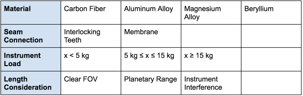 A sensitivity analysis of two relevant FOM equations, compressive load and coverage range, will reveal which variables have the greatest impact on our total utility function. To start that analysis, we consider the tradespace for space booms. The various choices available given our use case are listed in the following morphological matrix.