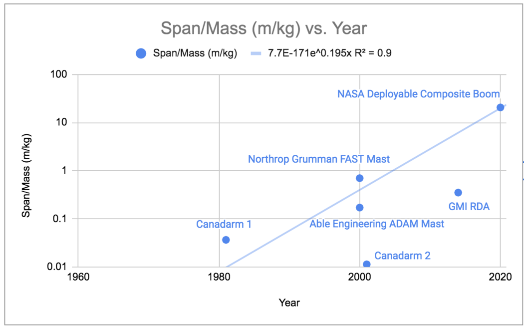 This figure shows the development of the span-to-mass ratio over time. There have been steady improvements since the 1980's and very rapid improvement in the last few years with NASA R&D simultaneously identifying a few geometric and material improvements.