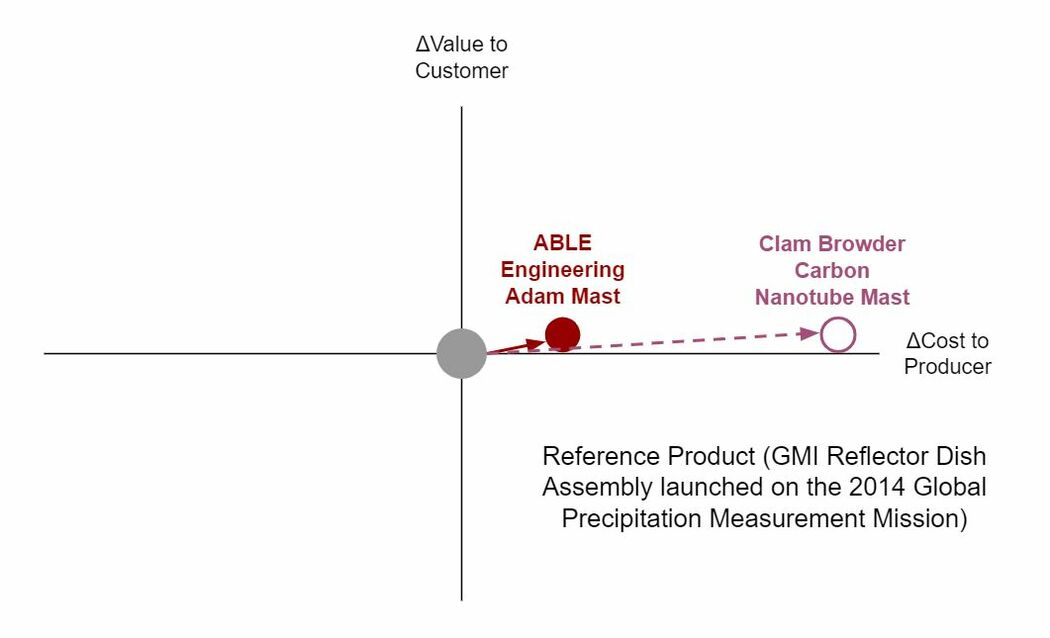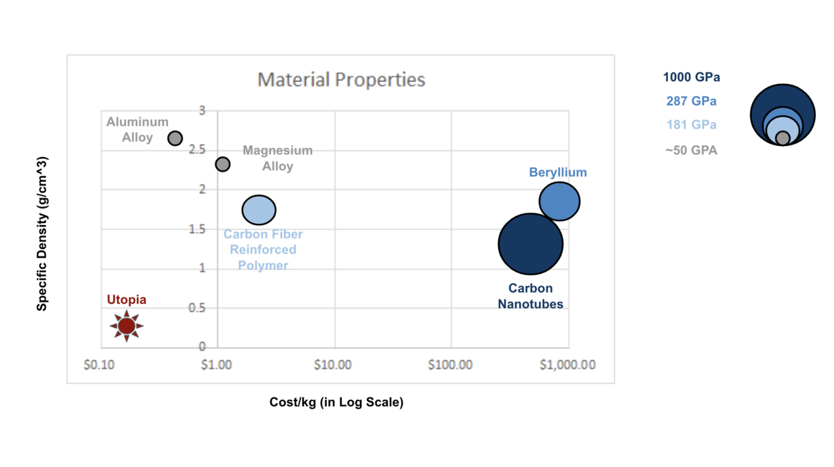 The previous chart demonstrates that Carbon Nanotube Structure Technology will both make space structures lighter and better at supporting instruments, but currently only does so at a significant increase in cost.