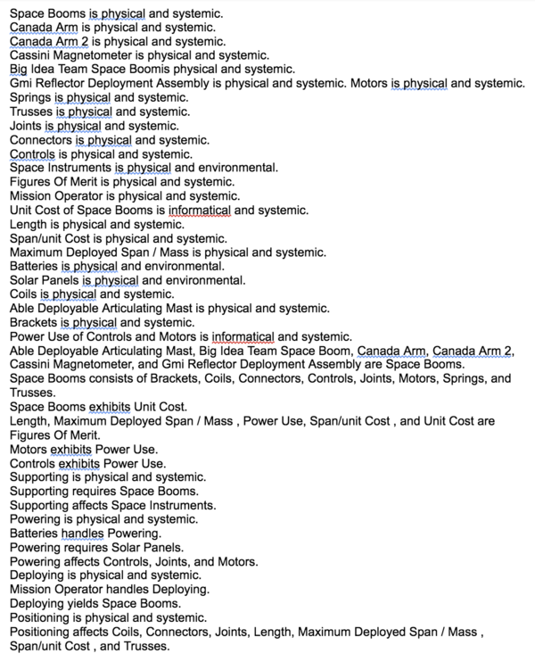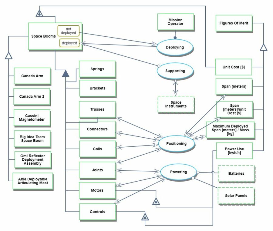 The Object Process Diagram (OPD) captures figures of merit, several examples of space booms, and the main processes and components involved in building and operating a space boom. An Object Process Language (OPL) description of the roadmap scope is auto-generated and shown on the right. This natural language and graphical depiction does an excellent job of communicating the primary processes that space booms perform and support. Additionally, it conveys the key components, key players, and core figures of merit for the domain.