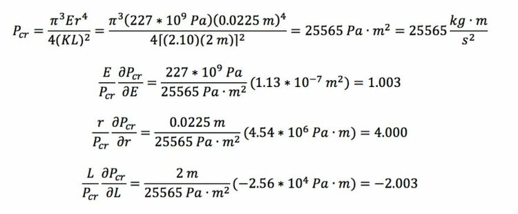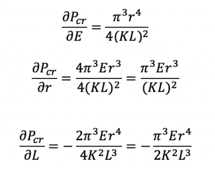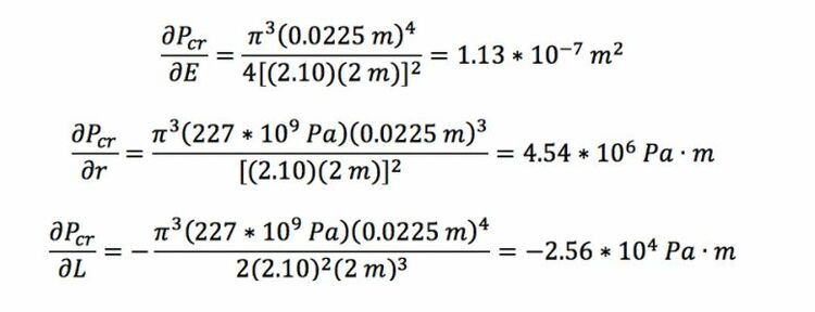 Calculating the partial derivatives of the critical compressive load with respect to variables E, r and L (K is a constant, so no partial derivative is calculated for it):