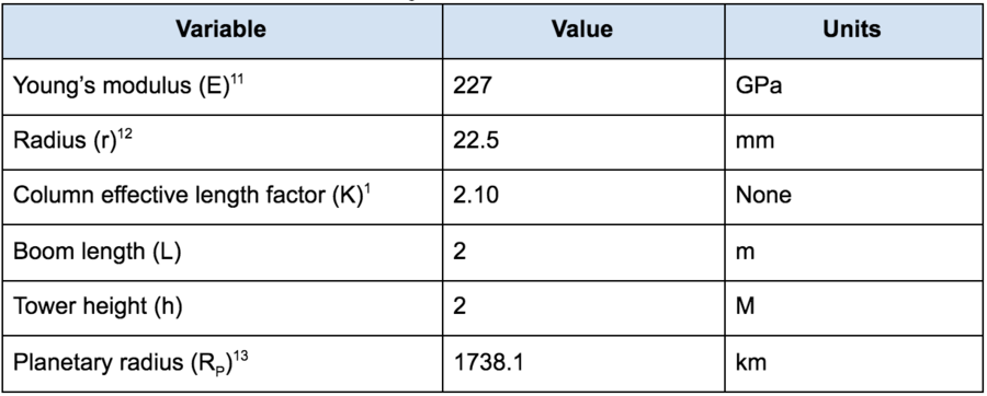 The next step in analysis is considering a simplified use case. For this analysis, we focus on boom designed for use on the Moon, where the boom will vertically support an instrument. In this scenario, we want to achieve sufficient coverage of the lunar surface. This makes defining equations and conducting a sensitivity analysis simpler because the forces expected (compressive loading) and the length requirement (based on range coverage of the Moon) form the utility function, with mass working to keep them efficient. In this case, critical load refers to the maximum load the space boom can carry when it is used as a tower, which is calculated with Euler’s critical load formula. Coverage range refers to the distance a payload on top of the space boom can see on a planetary surface, which is calculated using Pythagorean theorem. Plugging in the formulas for Euler's critical load and Pythagorean theorem into the utility equation: