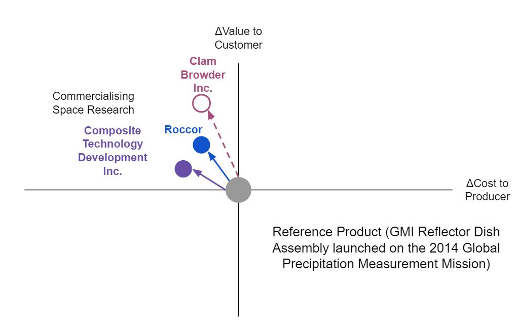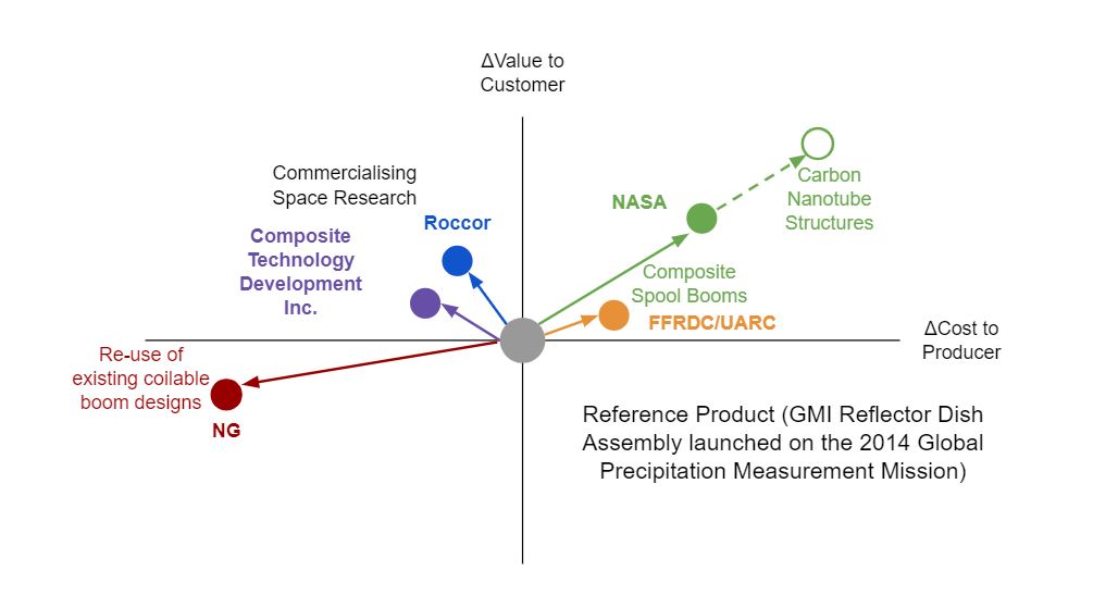 On the commercial side, there are two strategies. One is to try and commercialize, or make profitable, the previously stated novel solutions after they have been successfully demonstrated. Two small space company examples are listed who are working to refine, design for manufacturability, and proliferate a NASA spool boom technology: Roccor and Composite Technology Development (CTD), Inc. The second strategy, favored by large space companies, is to rely on mature, albeit dated technologies. For example, Northrop Grumman has re-used virtually the same coilable boom design, AstroMast, on more than a dozen missions dating back to the 1970’s. Value to the customer is based on an assessment of FOM that particular booms can achieve.