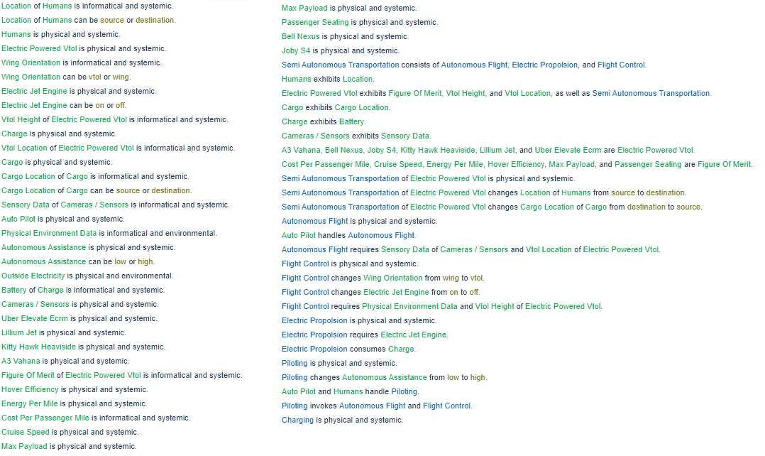 We provide an Object-Process-Diagram (OPD) of the 2EVL roadmap in the figure below. This diagram captures the main object of the roadmap (eVTOL), its various instances including main competitors, its decomposition into subsystems (wing, flight-control, autonomous control, electric propulsion), its characterization by Figures of Merit (FOMs) as well as the main processes (hovering, wing tilt).