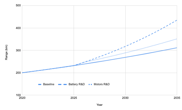 The range improves with each of these projects because improved batteries, or higher energy density, allows the eVTOL to have a higher energy storage capacity while holding the weight and physical size of the battery constant. One potential benefit of this advancement could be increasing the range of the aircraft. The baseline battery technology rate of improvement is currently estimated as 2%/year, and the project will help enable a firm to achieve 4% improvement year/year. The R&D project to improve the electric motors would serve to increase the overall propulsive efficiency, a change that is shown to have a 1:1 relationship with range in the technical model shown above.
