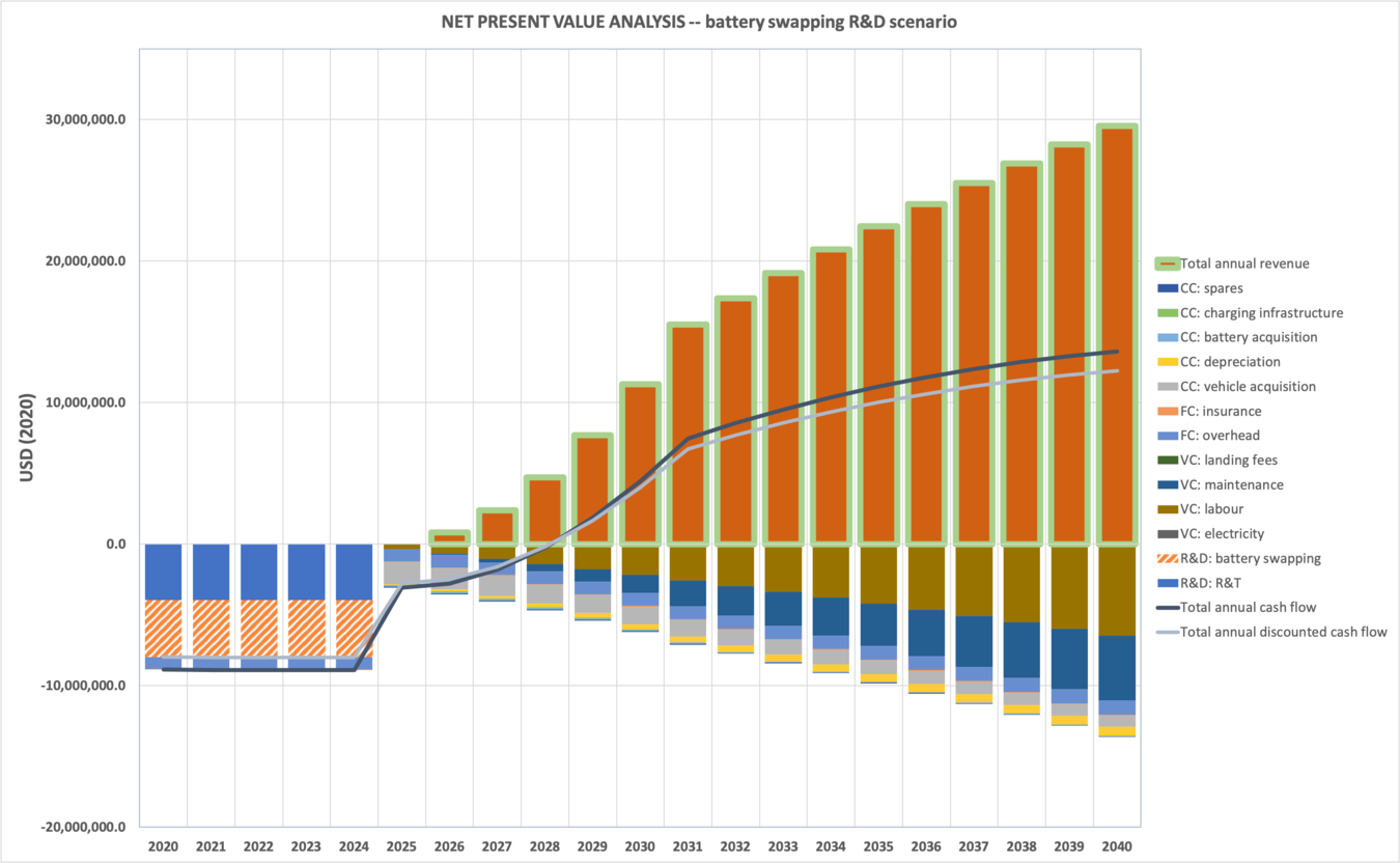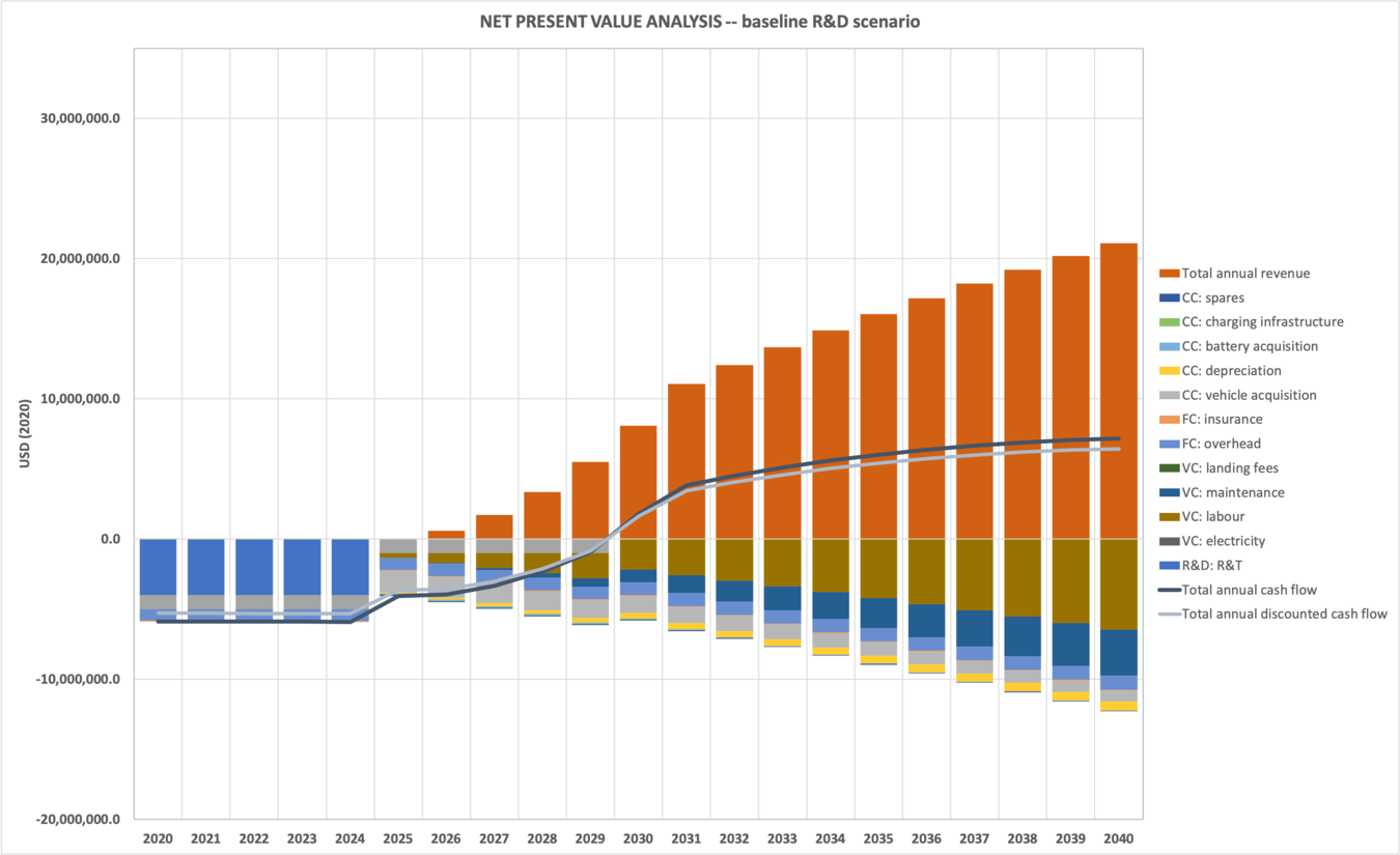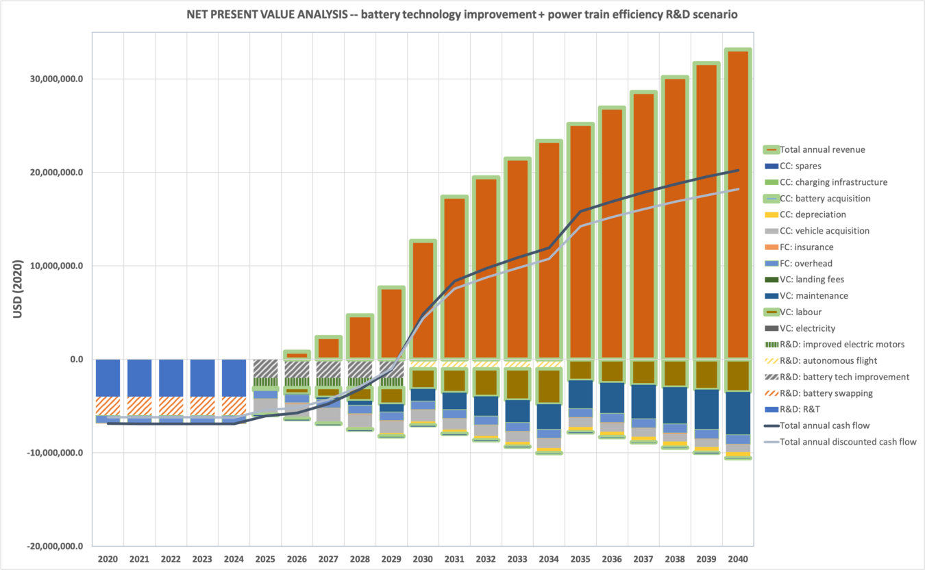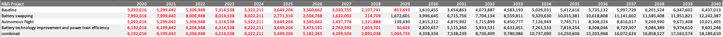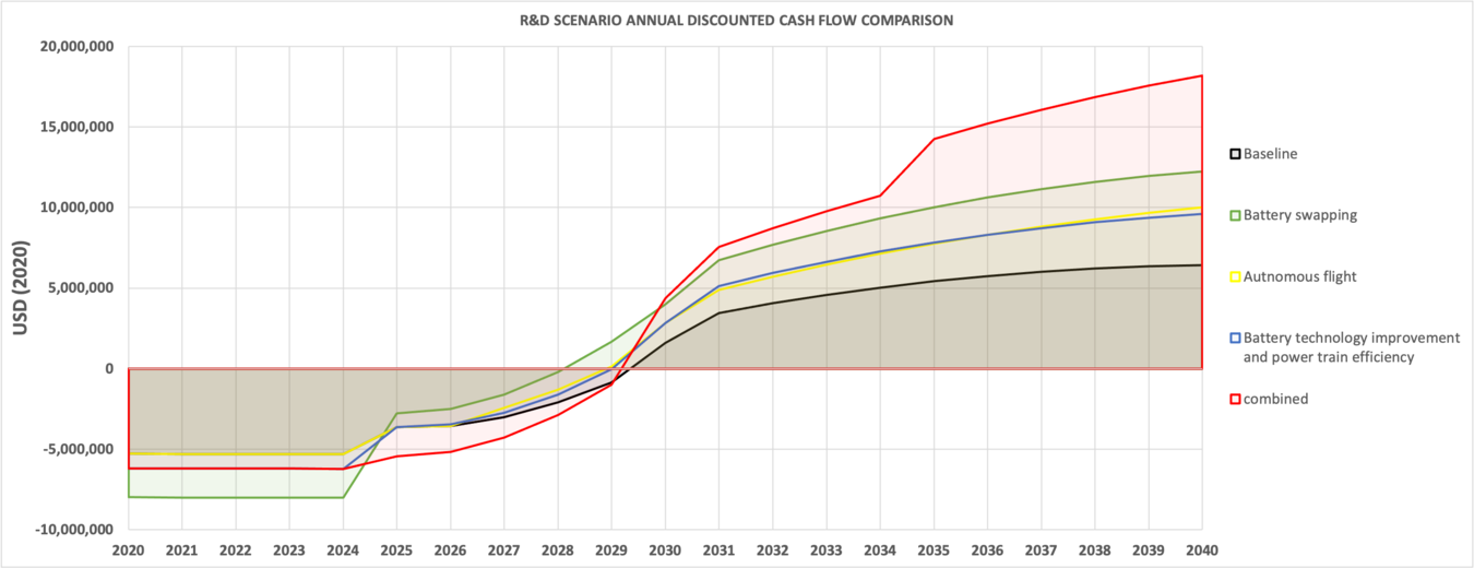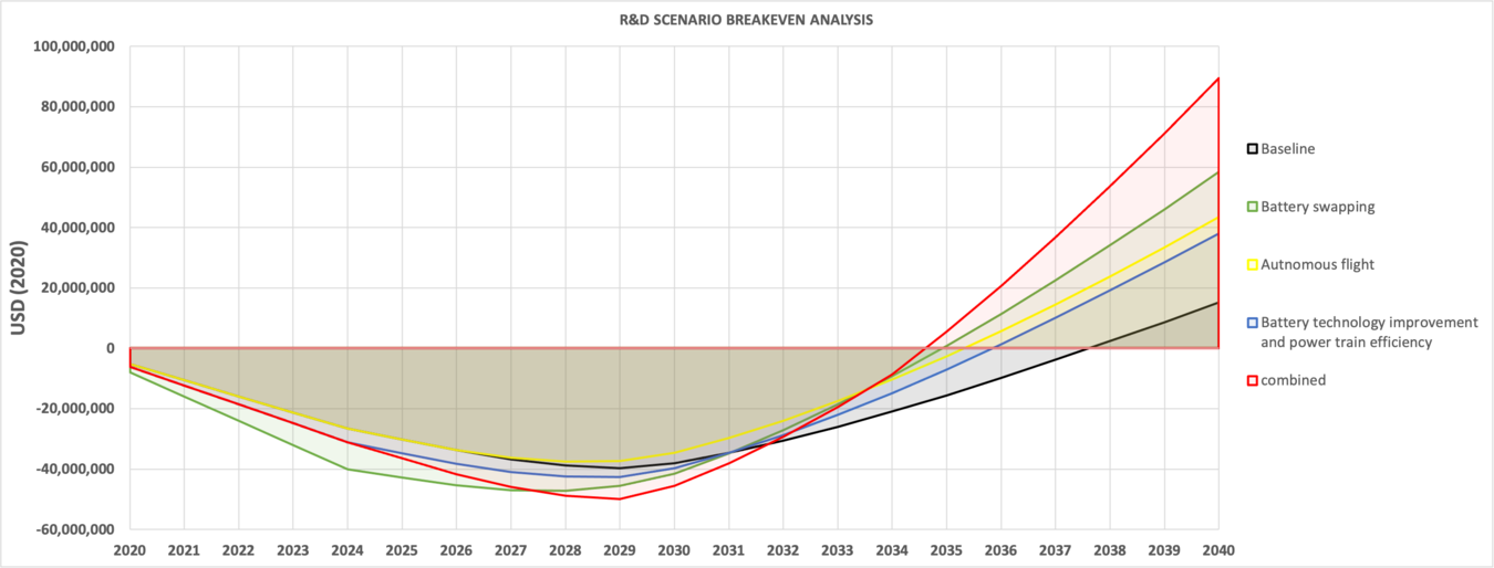 We decided to utilize this financial model to perform sensitivity analysis on the various potential R&D projects within the purview of an e-VTOL manufacturer and operator. The R&D projects we modeled were: 1) the baseline R&T product development; 2) battery swapping technology integration; 3) autonomous flight systems integration; 4) general battery technology improvement and power train efficiency investment. Now discussing the financial implications of each in turn: