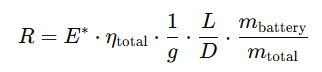 The model for range is based on the Breguet Range Equation. This equation is adopted for electric aircraft to include the energy density of the battery-electric system over fuel properties as in the traditional Breguet Range Equation to take the form