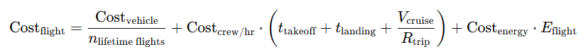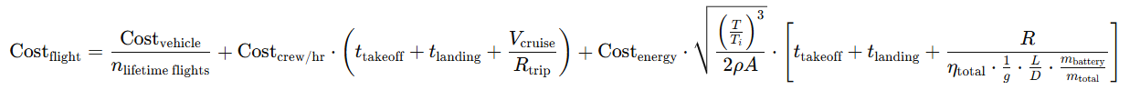 The other technical model created is for cost per flight of the eVTOL aircraft. The high level governing equation includes a cost per hour of crew wages, an amortized unit cost, and the energy cost of the flight as shown below.