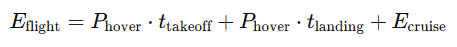 To develop a cost model that can be compared across multiple platforms, a baseline mission of fixed-time takeoff and landing periods, and a set-distance cruise was considered. These times, ttakeoff and tlanding are seen in the equation above. To determine the amount of energy needed for the flight, the mission segments must be broken down into their components. First, the power required to hover,