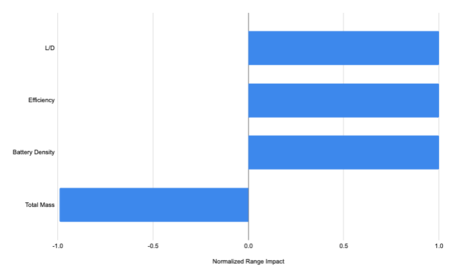 where E* is the specific energy of the battery system, ηtotal is the overall efficiency, L is lift, D is Drag and m is mass. This simple equation contains a lot of information about the impacts of the vehicle and propulsive system parameters on the system. A sensitivity analysis was performed on the L/D, total mass, energy density, and total efficiency, producing the tornado chart shown.