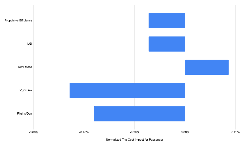 as the final equation for cost per flight, including all pertinent vehicle parameters. This final equation, with the underlying parameters embedded in these values, was analyzed for normalized sensitivity to changes in the total propulsive efficiency, Lift-to-drag ratio of the aircraft, total aircraft mass, cruise velocity and the number of flights per day. These sensitivities are plotted and shown in the corresponding tornado chart.