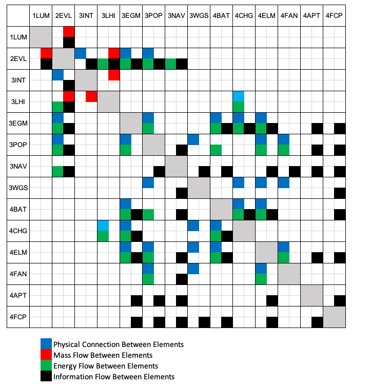 The matrix shown below represents the various interdependencies of major and minor subsystems of our eVTOL technology. The matrix shows which connections are physical, informatical, or whether they transmit energy or mass. Each connection in the matrix may have more than one form of interdependency.