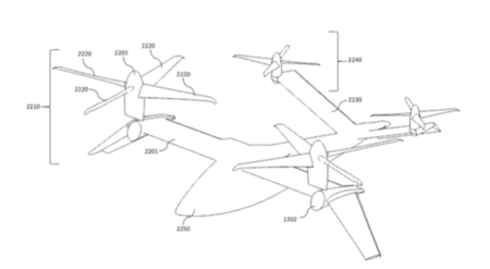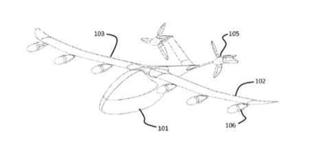 This patent, US 10,351,235, covers a specific eVTOL architecture consisting of four electrically driven rotors, and a horizontal wing-tail configuration. The aircraft is described to have a payload of 500-1300 lbs, and the range is not specified. This aircraft concept achieves vertical flight through articulating “tilt-rotors” on each of the four rotors in the concept. During vertical flight, they are all operating in the horizontal plane, providing vertical thrust for vertical take-off and landing. The aircraft has a long major wing, and a smaller tailplane behind it, each with two of the motor-propeller assemblies. In translational flight, the aircraft relies on the wing for lift, and the motors are responsible only for producing thrust. The rear rotors are on the ends of the horizontal tailplane, while the main rotors are near the end, with a wing extension protruding beyond.