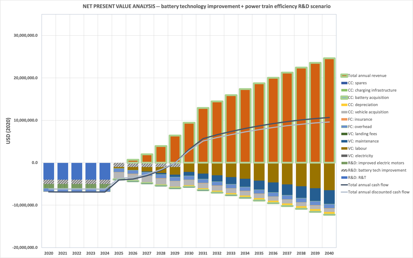Elaborating on how the figures above should be read, the first few years in each are typically R&D-dominant periods followed by a sustained revenue generation until 2040. Data below the x-axis represent stacked totals of the annual variable, fixed and capital costs whilst data above the x-axis represent revenues generated via passenger transport operations. Any diagonally patterned bars highlight the specific additional R&D cost associated with this R&D scenario. And bars highlighted in a green border indicate that these data series are directly impacted by the R&D investment associated with this scenario.