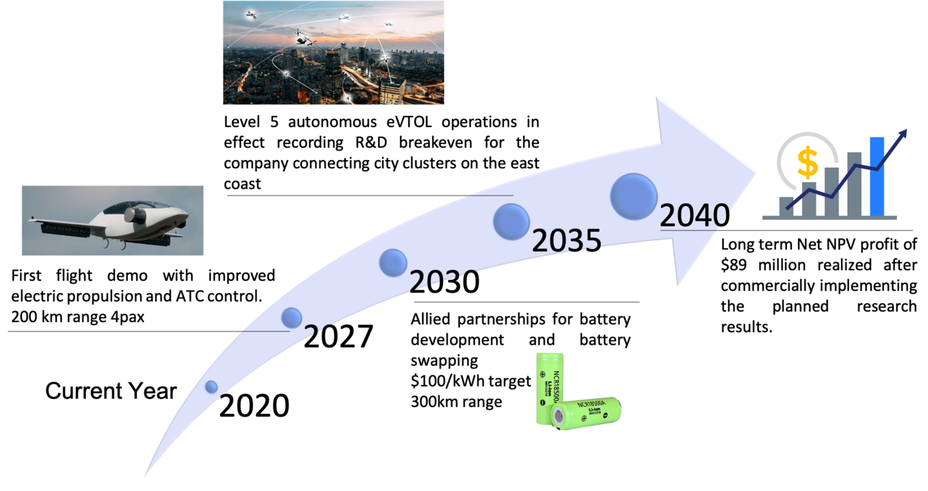 Our company aims to launch the UAM operations with the first iteration of a 5 seater aircraft by the year 2027, and thus focuses on the R&D projects in the fields of ATC control and improving the propulsion system of the eVTOL. With the pilot and testing going through 2027-2028, the focus would shift towards improving the battery tech in order to improve the range and no. of flights per day of the aircraft while focusing on improving the battery tech and the battery swapping mechanisms at the heliports. By the year 2035,we aim to achieve fully autonomous flight operations enabling regular intercity flights with a ride hailing service infrastructure in place. After the key R&D projects ave completed their initial deliverables and the improvements have been incorporated the results have been deployed, the company is projected to generate annual revenue of $35,000,000 in the year 2040.