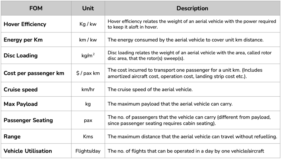 The table below shows a list of FOMs by which electric VTOL can be assessed. The first two and the last two are used to assess the aircraft itself. They are very similar to the FOMs that are used to compare traditional aircraft which are propelled by fossil fuels, the big difference being that 2EVL is essentially emissions-free during flight operations. The other rows represent subordinated FOMs that impact the performance and cost of eVTOL but are provided as outputs (primary FOMs) from lower-level roadmaps at level 3 or level 4, see the DSM above.