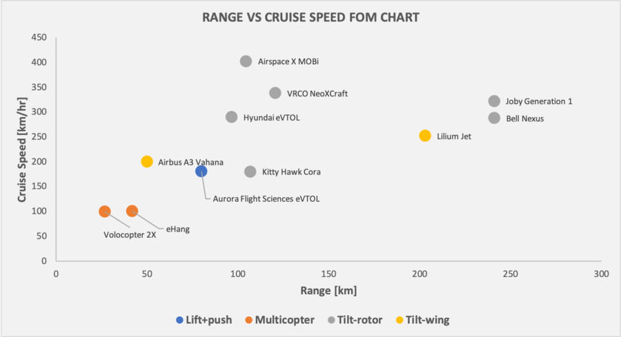 It is worth noting here that this table contains data for a variety of e-VTOL flight configurations. Each configuration has its pros and cons and the industry has not yet converged to an optimal configuration yet. Multicopter aircraft are typically designed to serve short-haul intra-city demand whilst tilt-wing, tilt-rotor and lift+push configurations achieve efficiency in cruise flight and therefore typically serve inter-city demand. Not all of these aircraft are in at the prototyping or production stages; some still remain conceptual. Performance specifications from such designs are subject to change in the future.