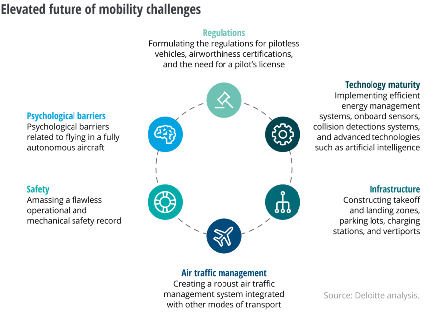 The Urban Air Mobility industry driven by eVTOLs have 5 focus areas that are important to enable their mass deployment and adoption. These areas are Regulations, Technology Maturity, Infrastrusture, Air Traffic Management, Operational Safety and Psychological barriers.